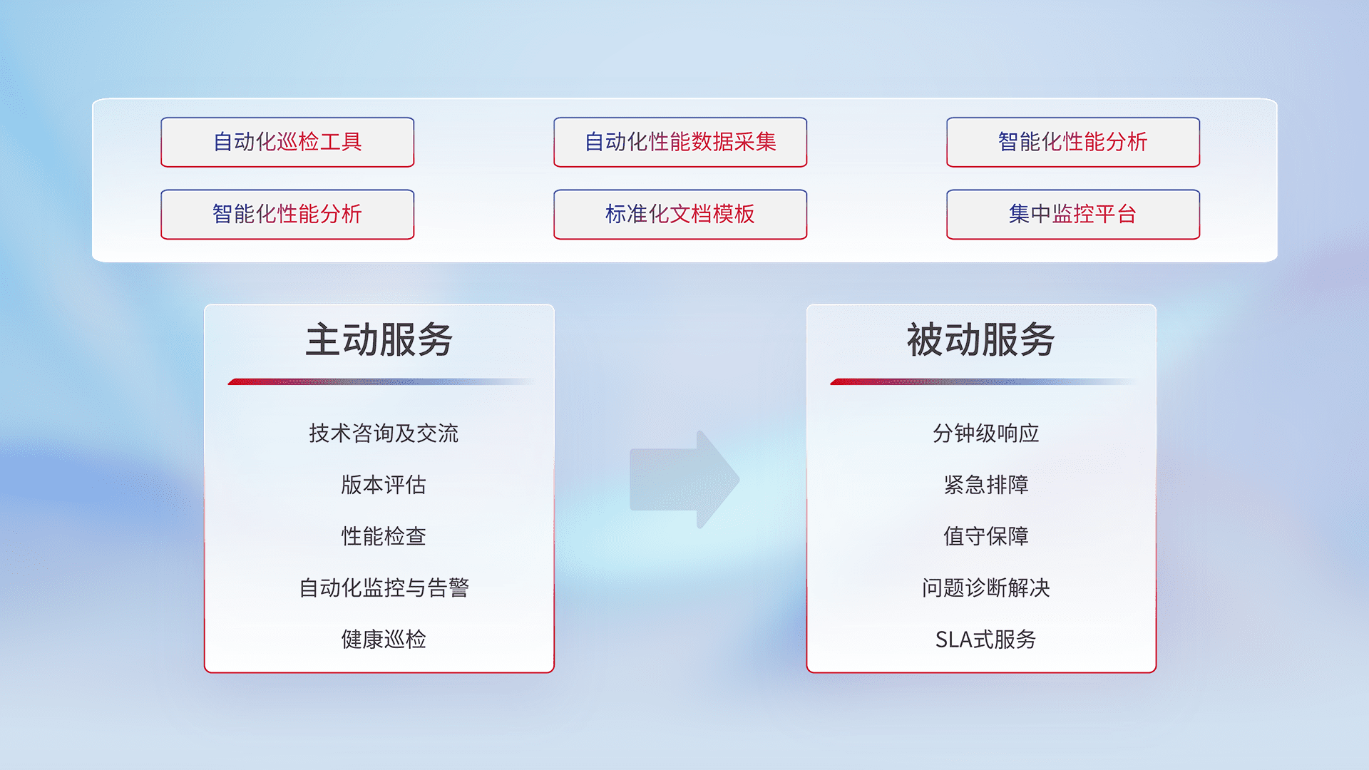 智能化工具和标准化文档,,,,保障服务质量,,提供主动服务(包含技术咨询、、、、版本评估、、、、性能检查、、、、自动化监控与告警、、、健康巡检)和被动服务包含(分钟级响应、、、、紧急排障、、值守保障、、问题诊断解决、、SLA服务)。。。。
