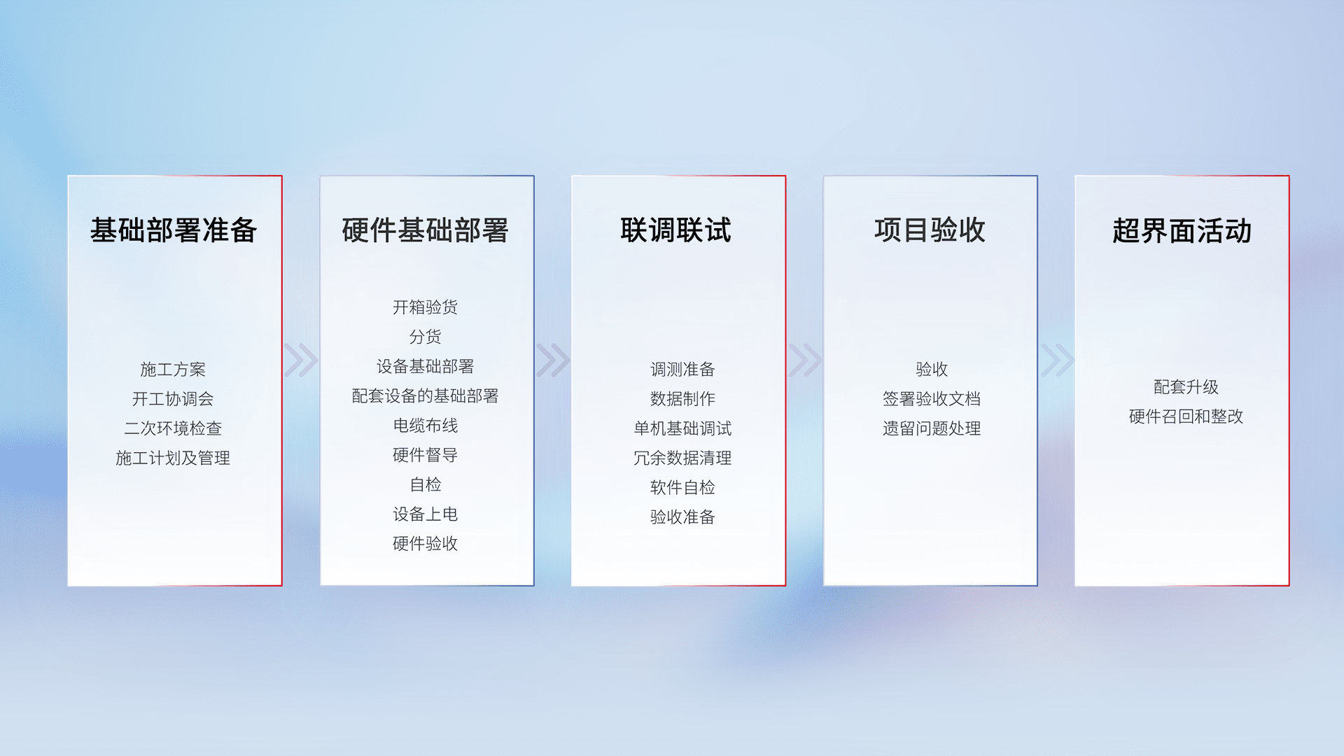 从基础部署准备、、、硬件基础部署、、、、联调联试、、、项目验收、、越界面活动的全过程可追溯,,,保证施工质量和进度。。。。